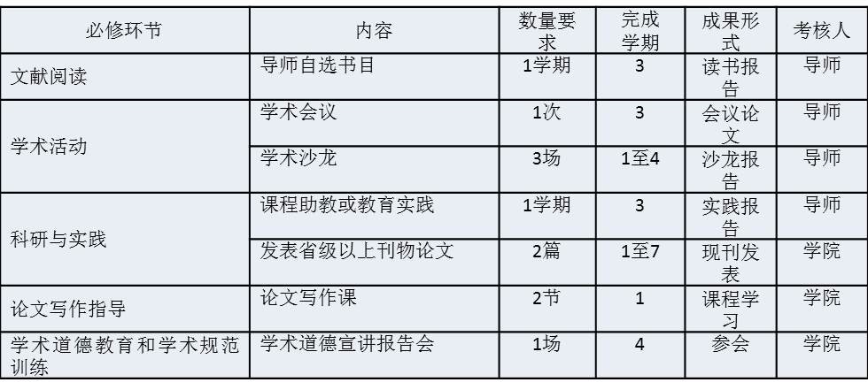 必修环节是研究生培养过程中除完成课程学习和学位(毕业)论文外还必须完成的其他科学研究、培养任务。具体包括文献阅读、学术活动、科研与实践、论文写作指导、学术道德教育和学术规范训练五项内容。分别由学院和导师完成考核。