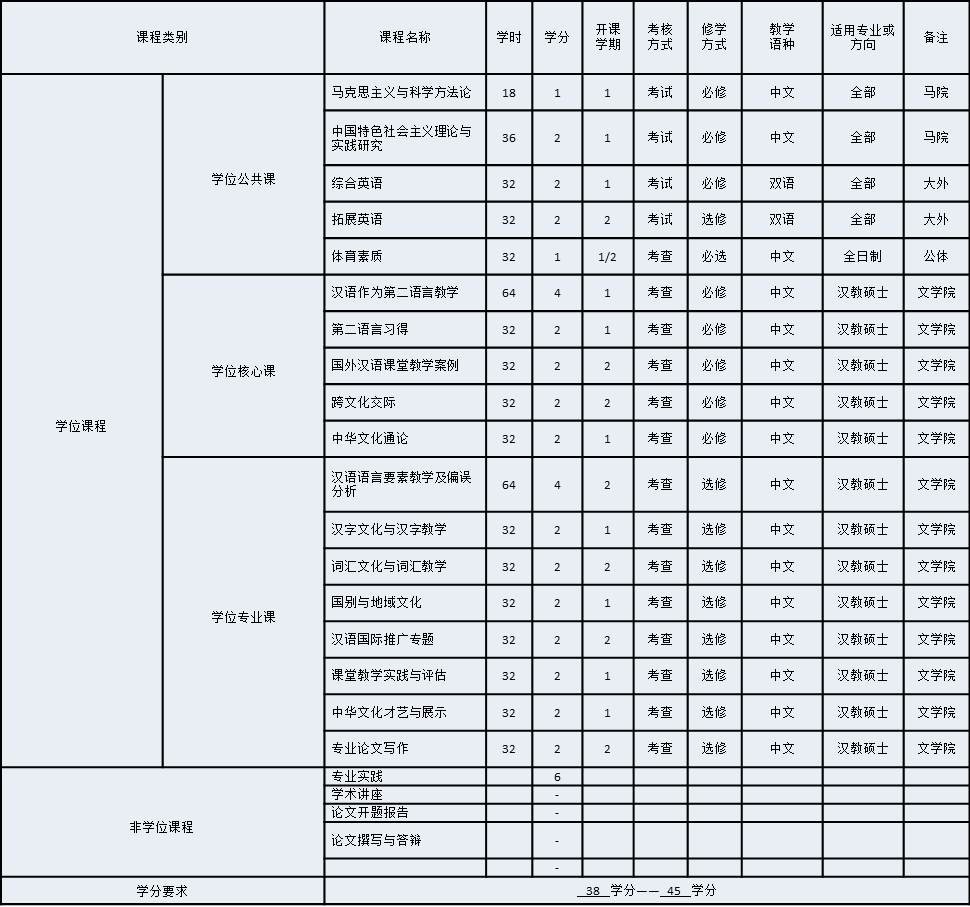 汉语国际教育专业硕士研究生培养实行学分制,总学分不少于38学分,不超过45学分。课程设置以实际应用为导向,以国际汉语教师的职业需求为目标,围绕汉语教学能力、中华文化传播能力和跨文化交际能力的培养,形成以核心课程为主导、模块拓展为补充、实践训练为重点的课程体系。汉语国际教育专业硕士研究生课程分为核心课程、模块拓展课程和实践训练课程。