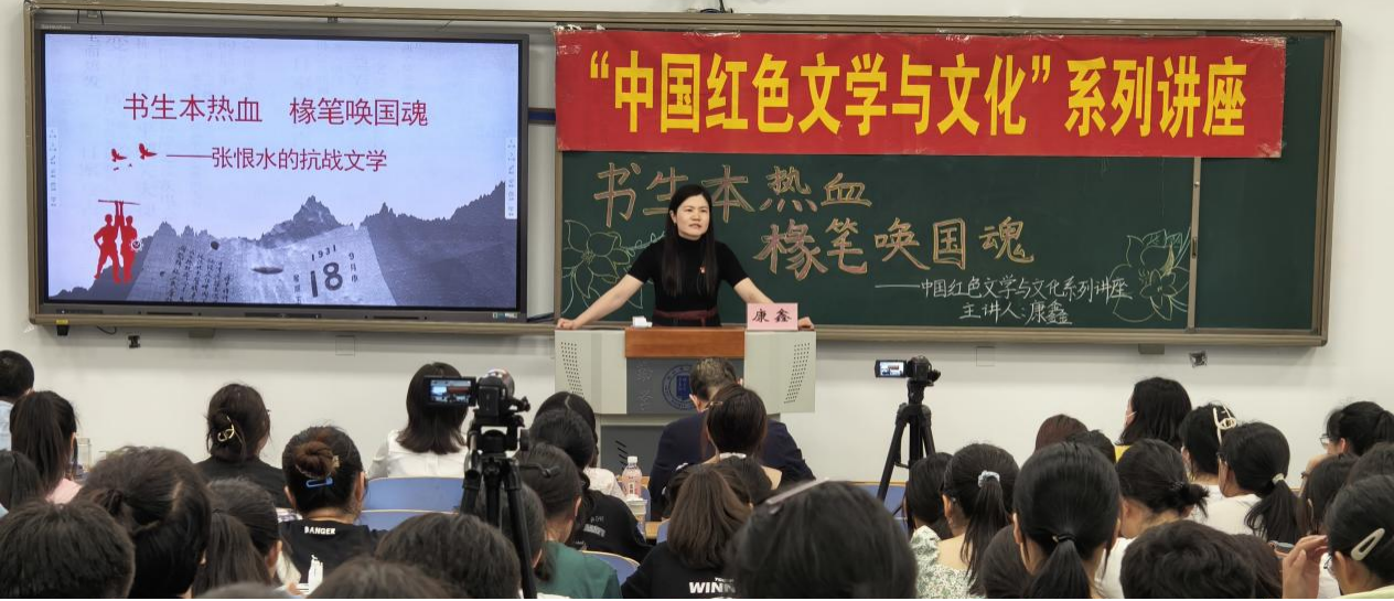 5月17日晚,伟德国际victor·1946源自“中国红色文学与文化”系列讲座第九讲开讲,康鑫副教授作了题为“书生本热血,椽笔唤国魂——张恨水的抗战文学”的讲座,学院党委副书记张艳主持,中国现当代文学党支部教师代表、辅导员老师、2022级本科生200余人参加了讲座。