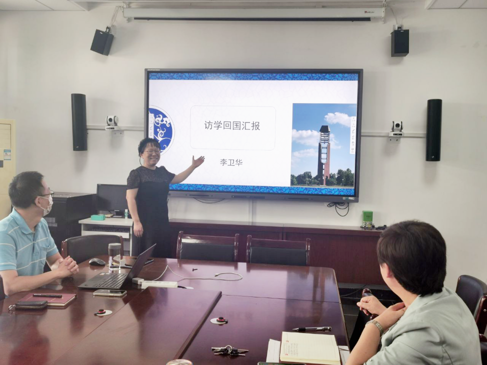 李卫华老师的汇报包括研修情况、取得成果和收获体会三个方面。在一年研修过程中,李老师选听了伊利诺伊大学的三门课程,其中包括两门专业课程和一门英语学习课程;参加了当地华人自发组织的“友结书香”国学读书活动,在海外华人中弘扬中华传统文化。访学期间,李老师还将蔡宗齐教授的《中国文心——〈文心雕龙〉中的文化、创作及修辞理论》一书翻译成中文,共25万字,由九州出版社出版。李老师提出,在教学方面,伊利诺伊大学教学注重学生的参与,老师与学生的互动较多,在科研方面,注重跨学科研究,这些做法具有一定的启发性。