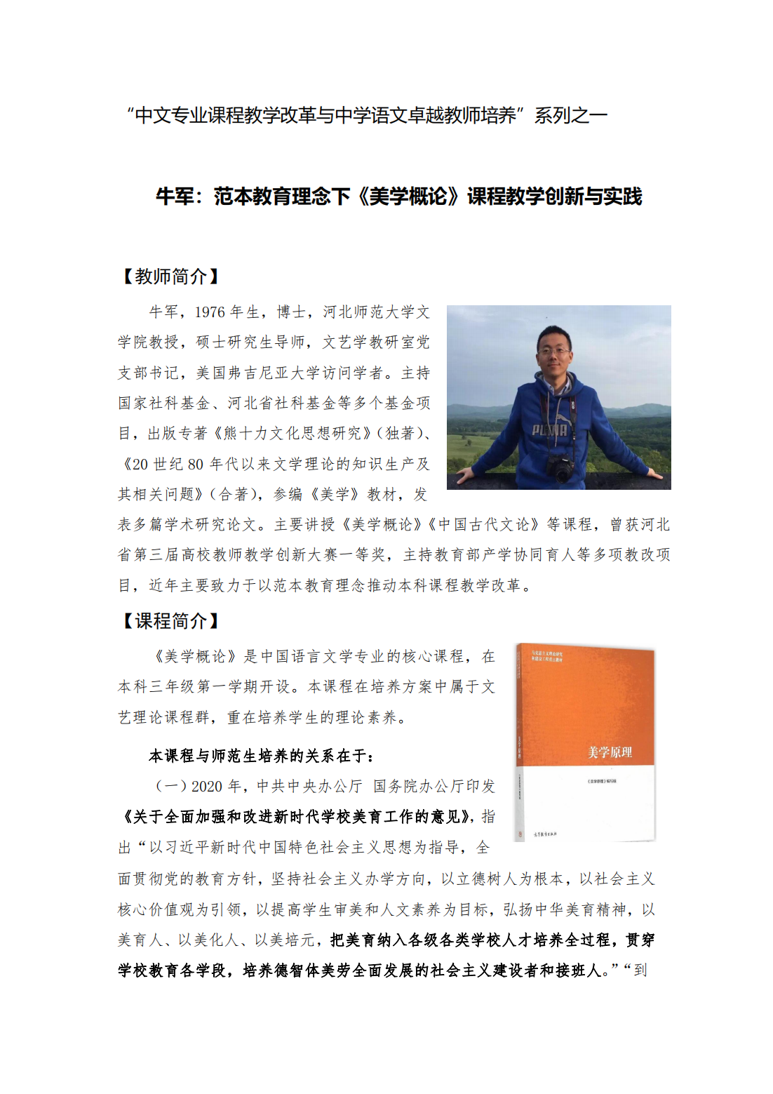 “课程教学改革与中学语文卓越教师培养”系列成果展示:牛军(范本教育理念下《美学概论》课程教学创新与实践)